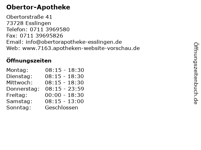 | Öffnungszeiten Obertor-Apotheke in Esslingen anzeigen | |