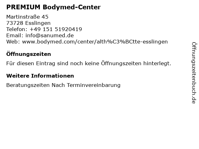 | Öffnungszeiten PREMIUM Bodymed-Center in Esslingen anzeigen | |