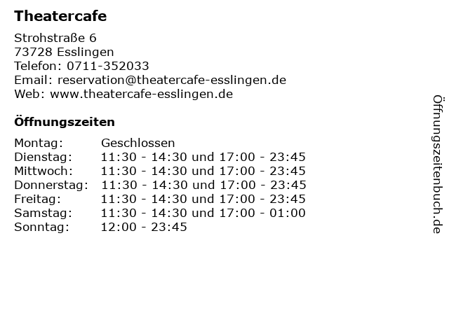 | Öffnungszeiten Theatercafe in Esslingen anzeigen | |