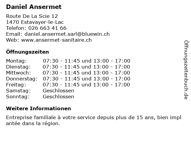 Öffnungszeiten Daniel Ansermet in Estavayer-le-Lac anzeigen | |