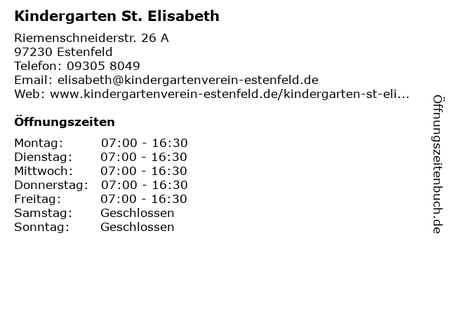 | Öffnungszeiten Kindergarten St. Elisabeth in Estenfeld anzeigen | |
