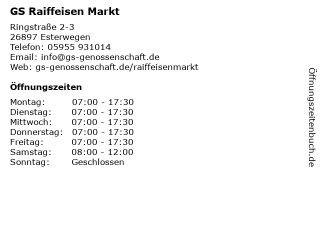 | Öffnungszeiten GS Raiffeisen Markt in Esterwegen anzeigen | |