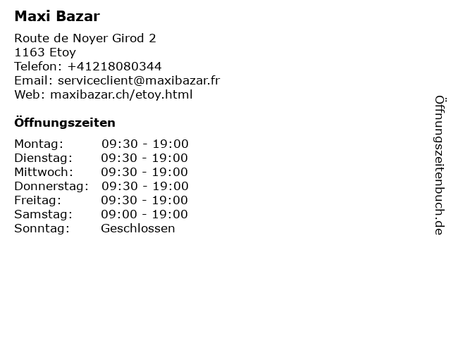 | Öffnungszeiten Maxi Bazar in Etoy anzeigen | |