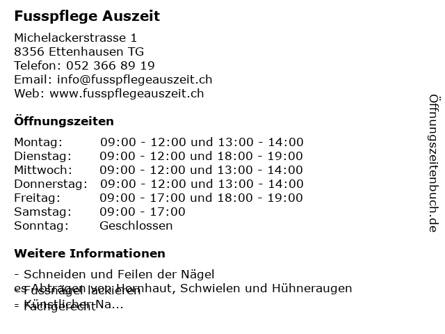 | Öffnungszeiten Fusspflege Auszeit in Ettenhausen TG anzeigen | |
