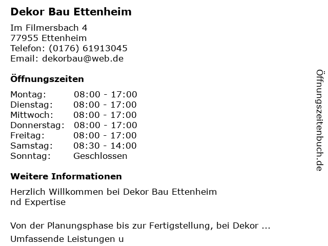 | Öffnungszeiten Dekor Bau Ettenheim in Ettenheim anzeigen | |