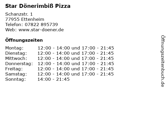| Öffnungszeiten Star Dönerimbiß Pizza in Ettenheim anzeigen | |