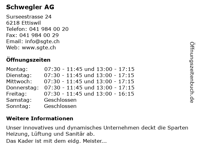 | Öffnungszeiten Schwegler AG in Ettiswil anzeigen | |
