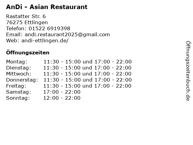 | Öffnungszeiten AnDi - Asian Restaurant in Ettlingen anzeigen | |