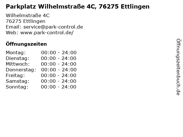 | Öffnungszeiten Parkplatz Wilhelmstraße 4C, 76275 Ettlingen in Ettlingen anzeigen | |