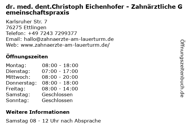 1 Dr. Regina Dauwe & Dr. Sabine Ziegler - hausärztlich- internistischen Gemeinschaftspraxis (Entfernung: 0,13 km) Scheffelstr. 19 A, 76275 Ettlingen 2 Dr. med. dent. Ullrich Seinige, Zahnärztin Claudia Seinige, Dr. med. dent. Daniel Grimm (Entfernung: 0,17 km) Pforzheimer Str 11, 76275 Ettlingen 3 Gemeinschaftspraxis Dr. med. Reinhold Schenkl und Dr. med. Annette Dier (Entfernung: 0,26 km) Am Dickhäuterplatz 1, 76275 Ettlingen 4 Christoph Kroschke AG Service-Point Ettlingen (Entfernung: 0,35 km) Am Lindscharren 1, 76275 Ettlingen 6 |