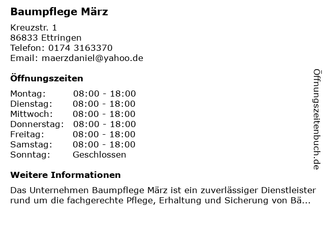 | Öffnungszeiten Baumpflege März in Ettringen anzeigen | |