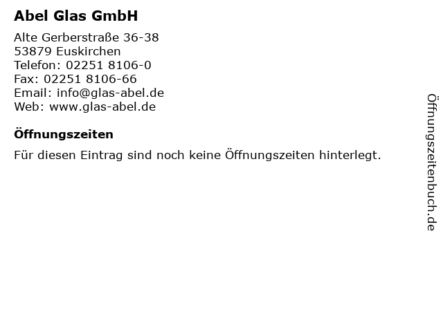 | Öffnungszeiten Abel Glas GmbH in Euskirchen anzeigen | |