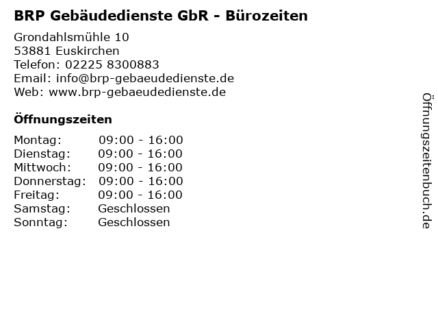 Branchen & Suchbegriffe zu BRP Gebäudedienste GbR - Bürozeiten:brp, bürozeiten, dachrinnenreinigung, fensterreinigung, gbr, gebäudedienste, gewerbliche reinigung, teppichreinigungsdienst |