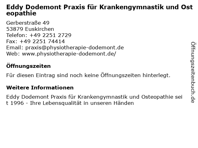 | Eddy Dodemont Praxis für Krankengymnastik und Osteopathie anrufen | |