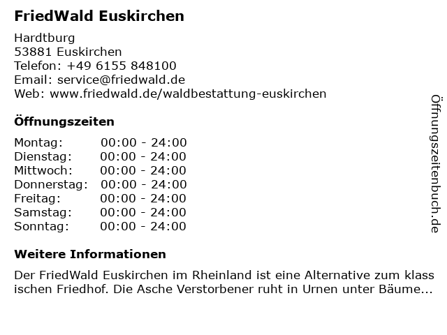| Öffnungszeiten FriedWald Euskirchen in Euskirchen anzeigen | |
