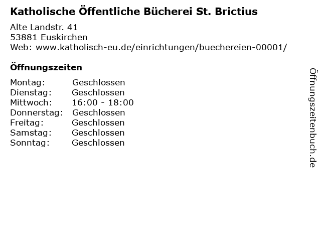 | Öffnungszeiten Katholische Öffentliche Bücherei St. Brictius in Euskirchen anzeigen | |