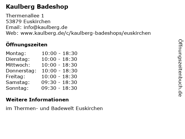 | Öffnungszeiten Kaulberg Badeshop in Euskirchen anzeigen | |