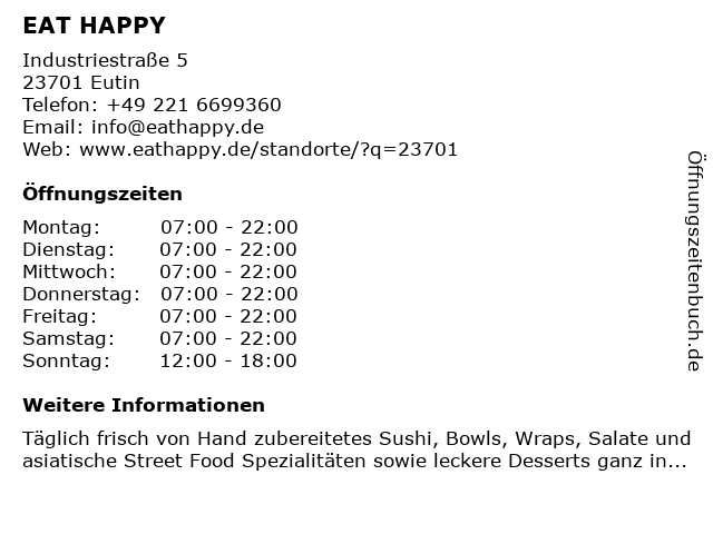 | Öffnungszeiten EAT HAPPY in Eutin anzeigen | |