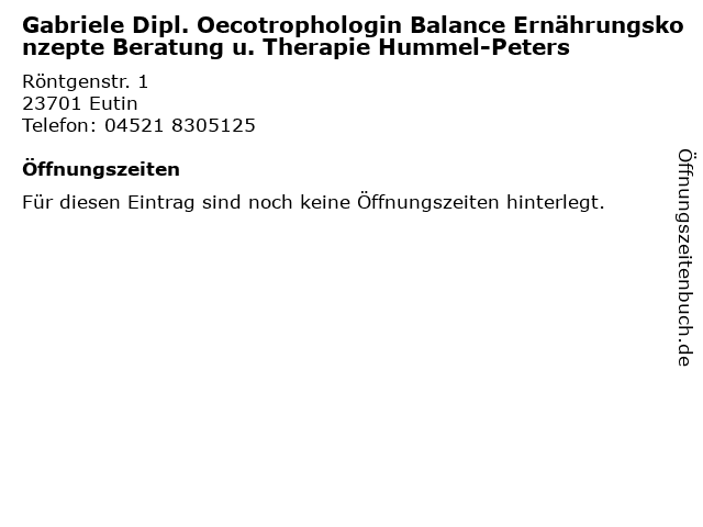 | Gabriele Dipl. Oecotrophologin Balance Ernährungskonzepte Beratung u. Therapie Hummel-Peters anrufen | |