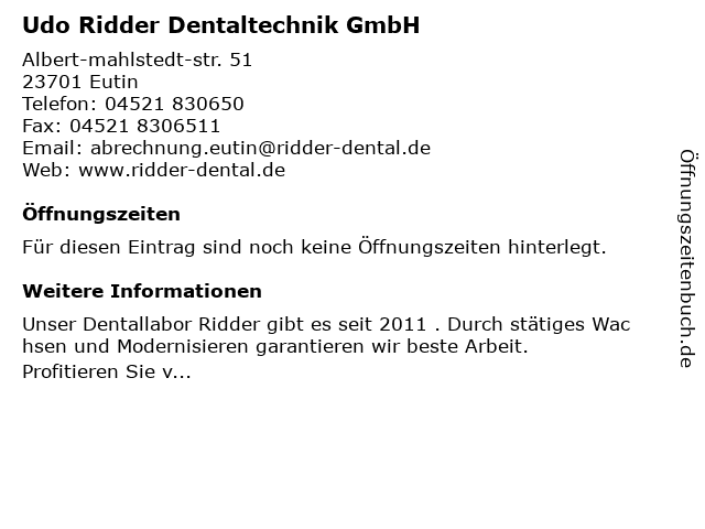 | Öffnungszeiten Udo Ridder Dentaltechnik GmbH in Eutin anzeigen | |