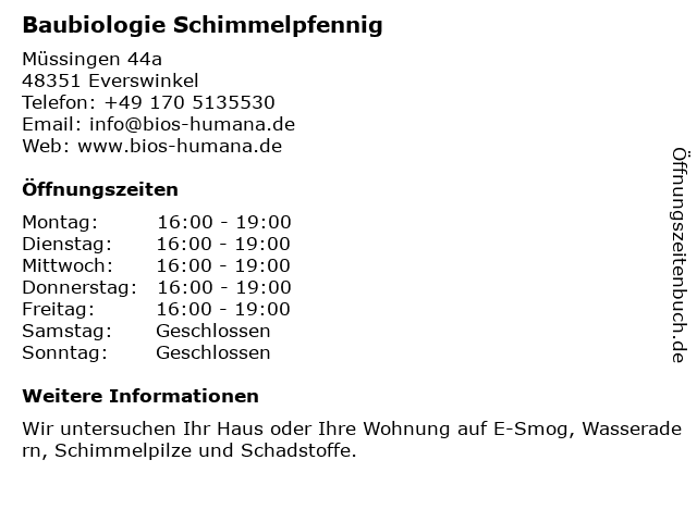 1 Baubiologie-Holtrup: Sachverständiger für Schimmelpilze, Schadstoffe, Elektrosmog (Entfernung: 8,80 km) Gröblingen 71, 48336 Sassenberg 3 Udo Schöne Heilpraktiker Schmerztherapie u. alle Naturheilv. (Entfernung: 5,43 km) Bülstr. 16, 48231 Warendorf 4 Baubiologe u. Sachverständiger Holtrup (Entfernung: 8,80 km) Gröblingen 71, 48221 Warendorf Bei Münster 6 Privatpraxis für Chiropraktik, Osteopathie, Akupunktur und Schmerztherapie - Matthias Nowak (Heilpraktiker) (Entfernung: 17,32 km) Wolbecker Str. 77, 48155 Münster |