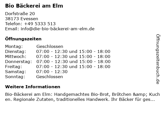 | Öffnungszeiten Bio Bäckerei am Elm in Evessen anzeigen | |