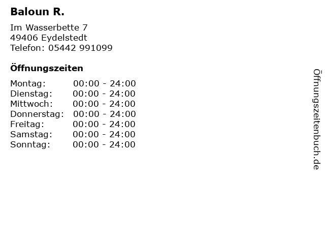| Öffnungszeiten Baloun R. in Eydelstedt anzeigen | |