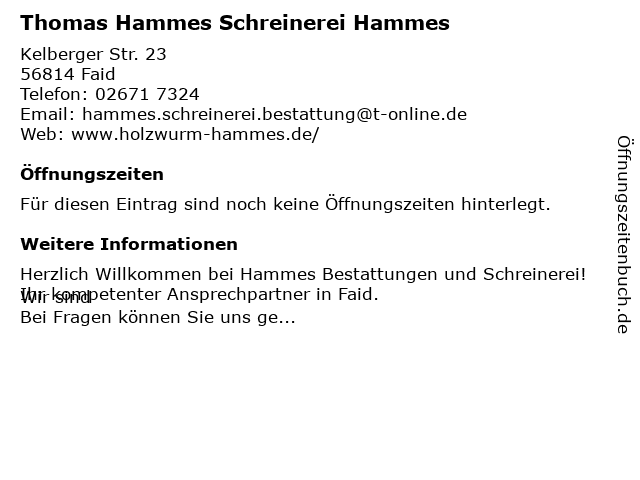 | Öffnungszeiten Thomas Hammes Schreinerei Hammes in Faid anzeigen | |