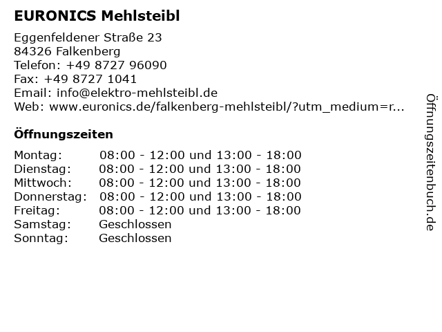 | Öffnungszeiten EURONICS Mehlsteibl in Falkenberg anzeigen | |