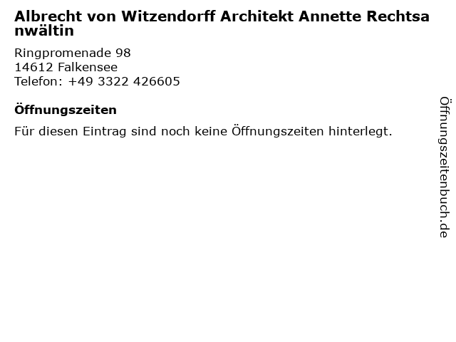 | Albrecht von Witzendorff Architekt Annette Rechtsanwältin anrufen | |