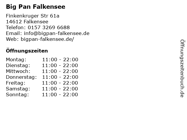 | Öffnungszeiten Big Pan Falkensee in Falkensee anzeigen | |