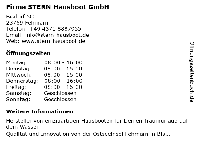 | Öffnungszeiten Firma STERN Hausboot GmbH in Fehmarn anzeigen | |
