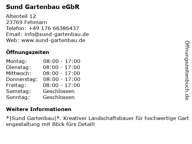 | Öffnungszeiten Sund Gartenbau eGbR in Fehmarn anzeigen | |