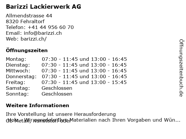| Öffnungszeiten Barizzi Lackierwerk AG in Fehraltorf anzeigen | |
