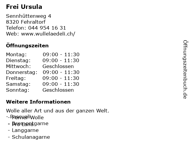 | Öffnungszeiten Frei Ursula in Fehraltorf anzeigen | |