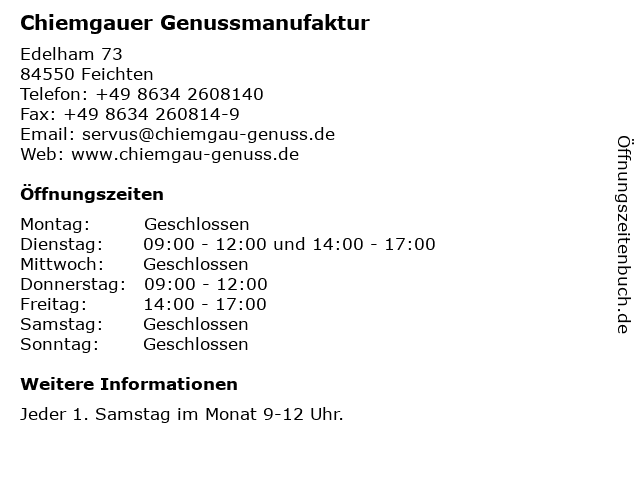 5 Chiemgauer Genussmanufaktur - Lagerverkauf (Entfernung: 8,09 km) Hauptstraße 12, 83349 Palling/Freutsmoos 6 Chiemgauer Internet Antiquariat, Frauke Strassberger (Entfernung: 11,48 km) Am Strohhof 6 a, 83352 Altenmarkt |