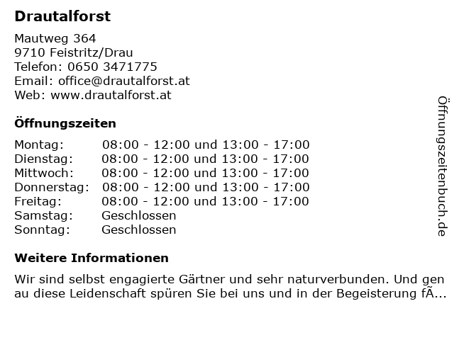 | Öffnungszeiten Drautalforst in Feistritz/Drau anzeigen | |