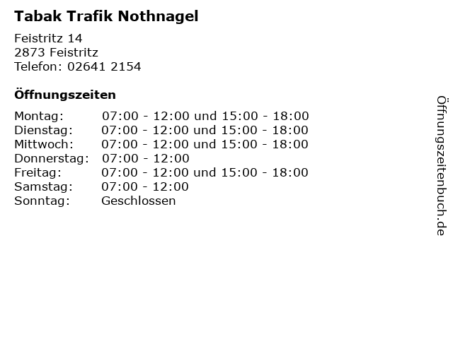 | Öffnungszeiten Tabak Trafik Nothnagel in Feistritz anzeigen | |