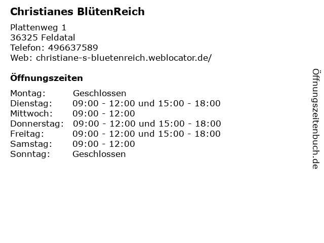 | Öffnungszeiten Christianes BlütenReich in Feldatal anzeigen | |