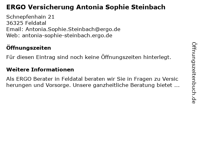 | Öffnungszeiten ERGO Versicherung Antonia Sophie Steinbach in Feldatal anzeigen | |