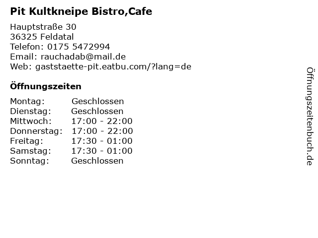 | Telefonnummer Pit Kultkneipe Bistro,Cafe in Feldatal (0175 5472994) anrufen | |