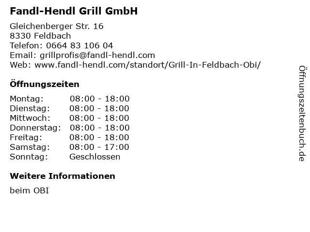 | Öffnungszeiten Fandl-Hendl Grill GmbH in Feldbach anzeigen | |