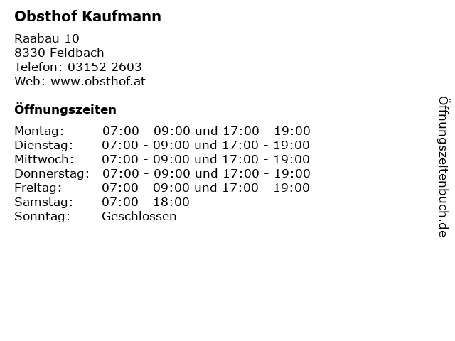 | Öffnungszeiten Obsthof Kaufmann in Feldbach anzeigen | |