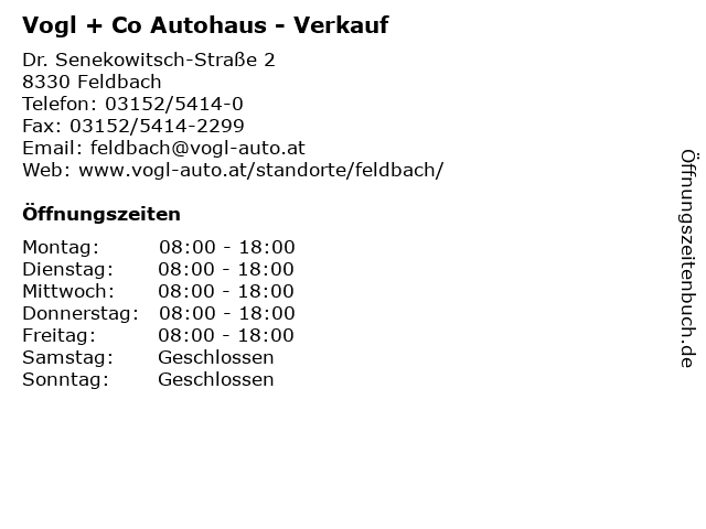 1 Vogl + Co Autohaus - Werkstatt & Ersatzteillager (Entfernung: 0,00 km) Dr. Senekowitsch-Straße 2, 8330 Feldbach 3 Vogl + Co GmbH Autohaus - Werkstatt und Ersatzteillager (Entfernung: 30,58 km) Industriestraße 10, 8430 Leibnitz 5 Vogl + Co Autohaus - Werkstatt und Ersatzteillager (Entfernung: 37,12 km) Schießstattgasse 65, 8010 Graz 6 |