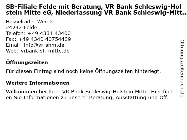 | SB-Filiale Felde mit Beratung, VR Bank Schleswig-Holstein Mitte eG, Niederlassung VR Bank Schleswig-Mittelholstein anrufen | |