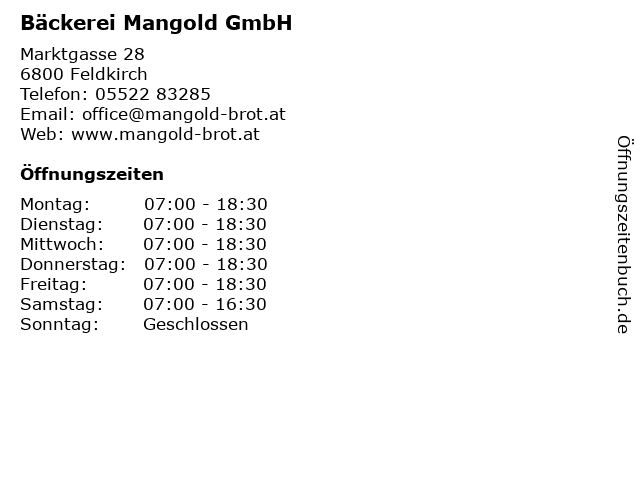 | Öffnungszeiten Bäckerei Mangold GmbH in Feldkirch anzeigen | |