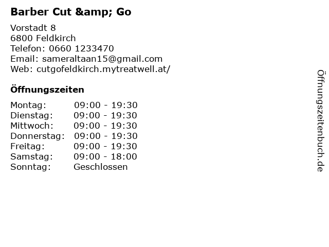 | Öffnungszeiten Barber Cut & Go in Feldkirch anzeigen | |
