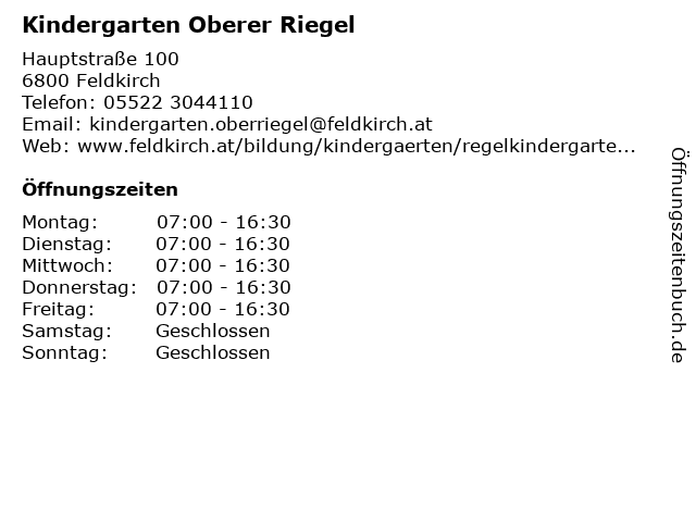 | Öffnungszeiten Kindergarten Oberer Riegel in Feldkirch anzeigen | |