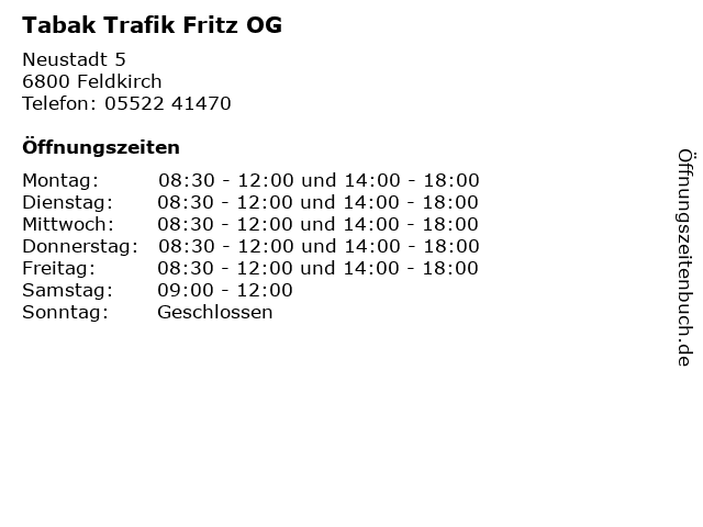 | Öffnungszeiten Tabak Trafik Fritz OG in Feldkirch anzeigen | |