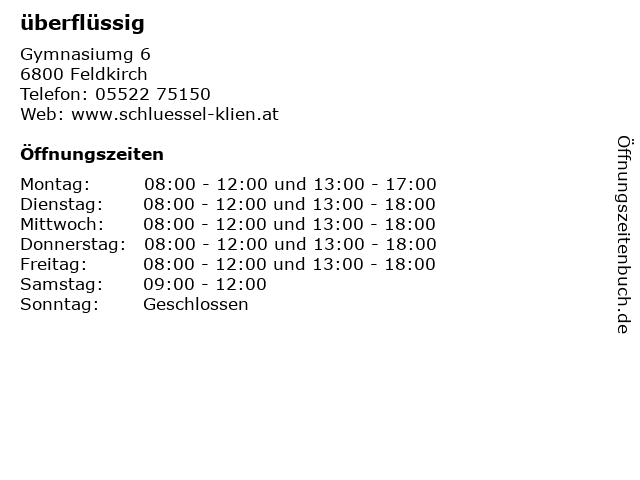 | Öffnungszeiten überflüssig in Feldkirch anzeigen | |